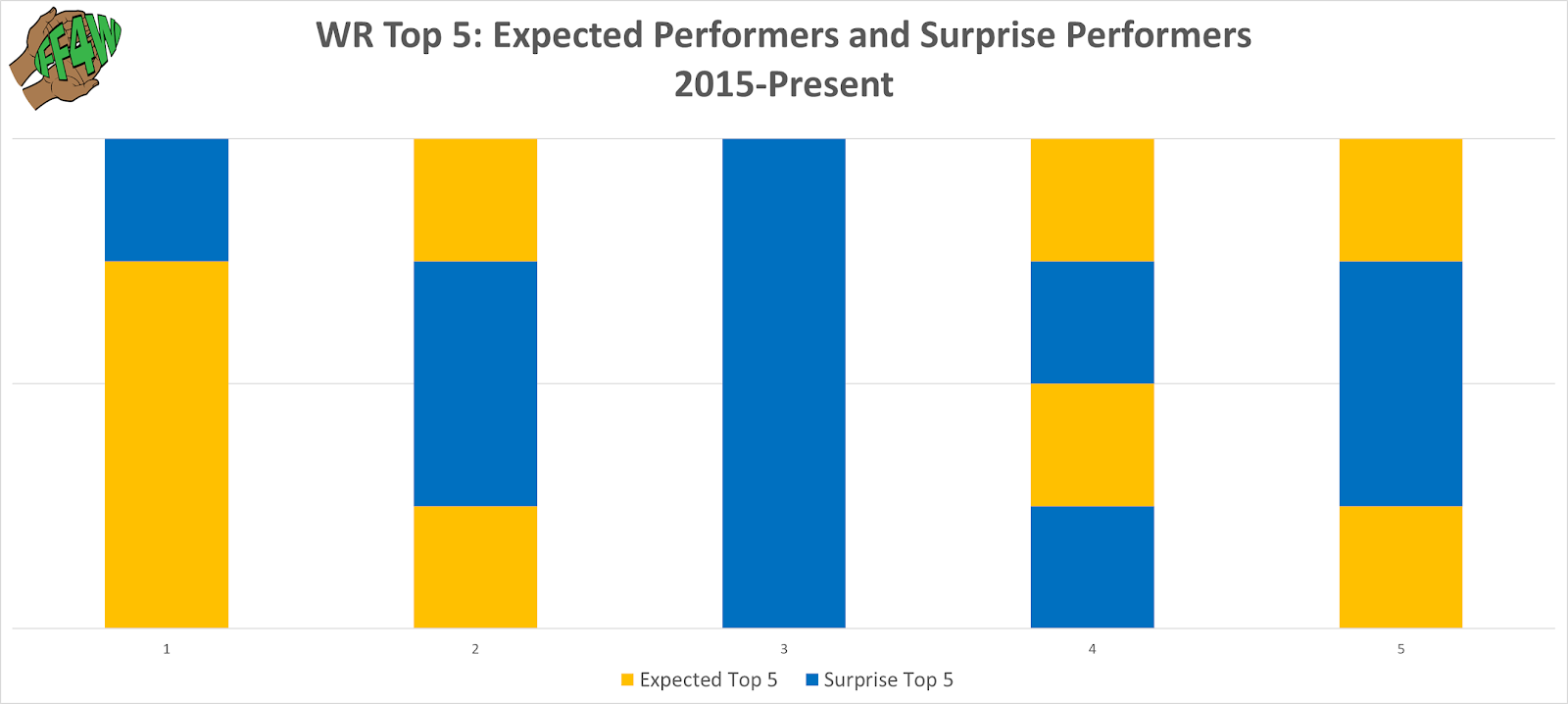 So where do WRs fit in? What makes them special . . . and unlovable? As with QBs and RBs, the following data features every WR scorer (about 800 total) and ADPs for each year's top 50 preseason WRs, spanning 2015-2018.